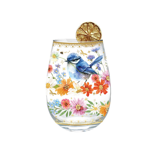 Lisa Pollock Stemless Glass Gold Detailing With 24K Gold Lime Garnish Floral Wren