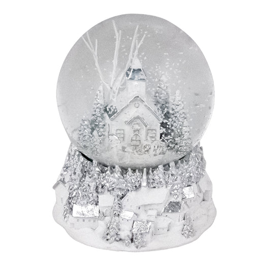 CHRISTMAS RESIN WHITE & SILVER WATERBALL CHURCH SMALL