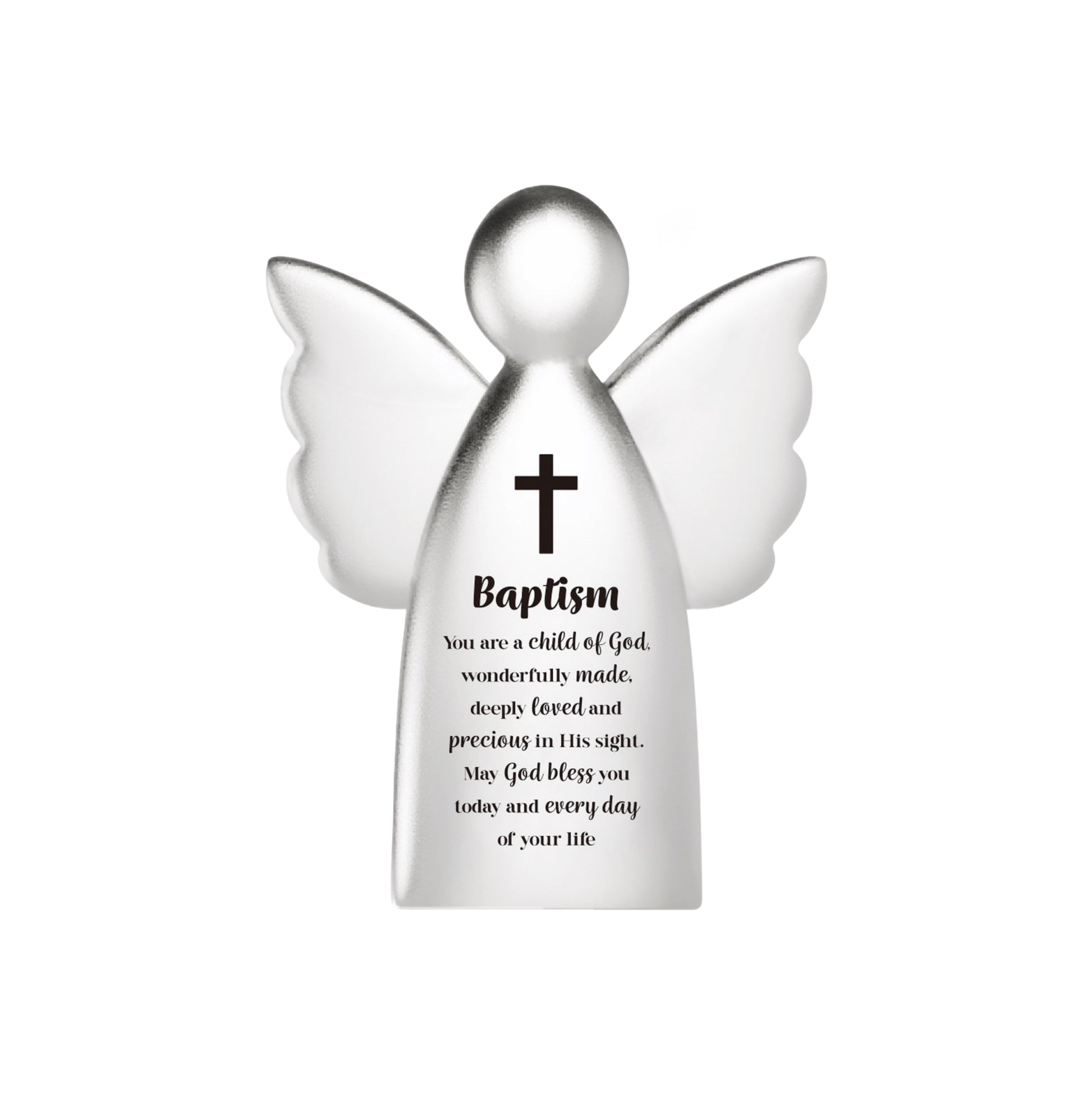 Elegant metal angel figurine with a shiny finish, ideal for commemorating Baptism celebrations. Features an intricate angelic design that adds a timeless touch to any space. Compact and sturdy, it serves as a lasting keepsake.