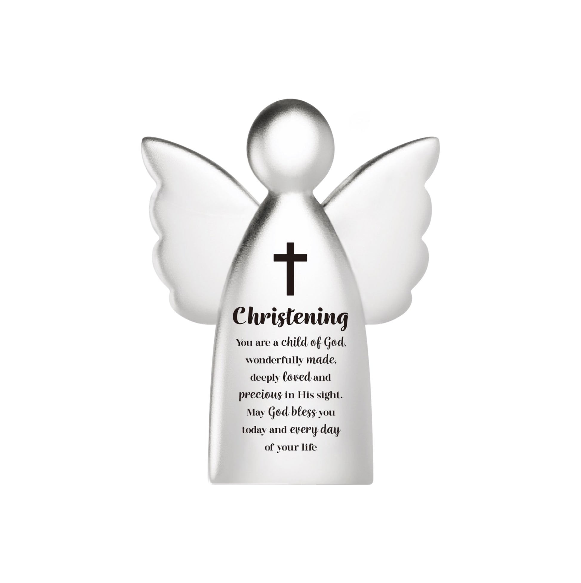 Elegant metal angel figurine with a shiny finish, ideal for commemorating christening celebrations. Features an intricate angelic design that adds a timeless touch to any space. Compact and sturdy, it serves as a lasting keepsake.