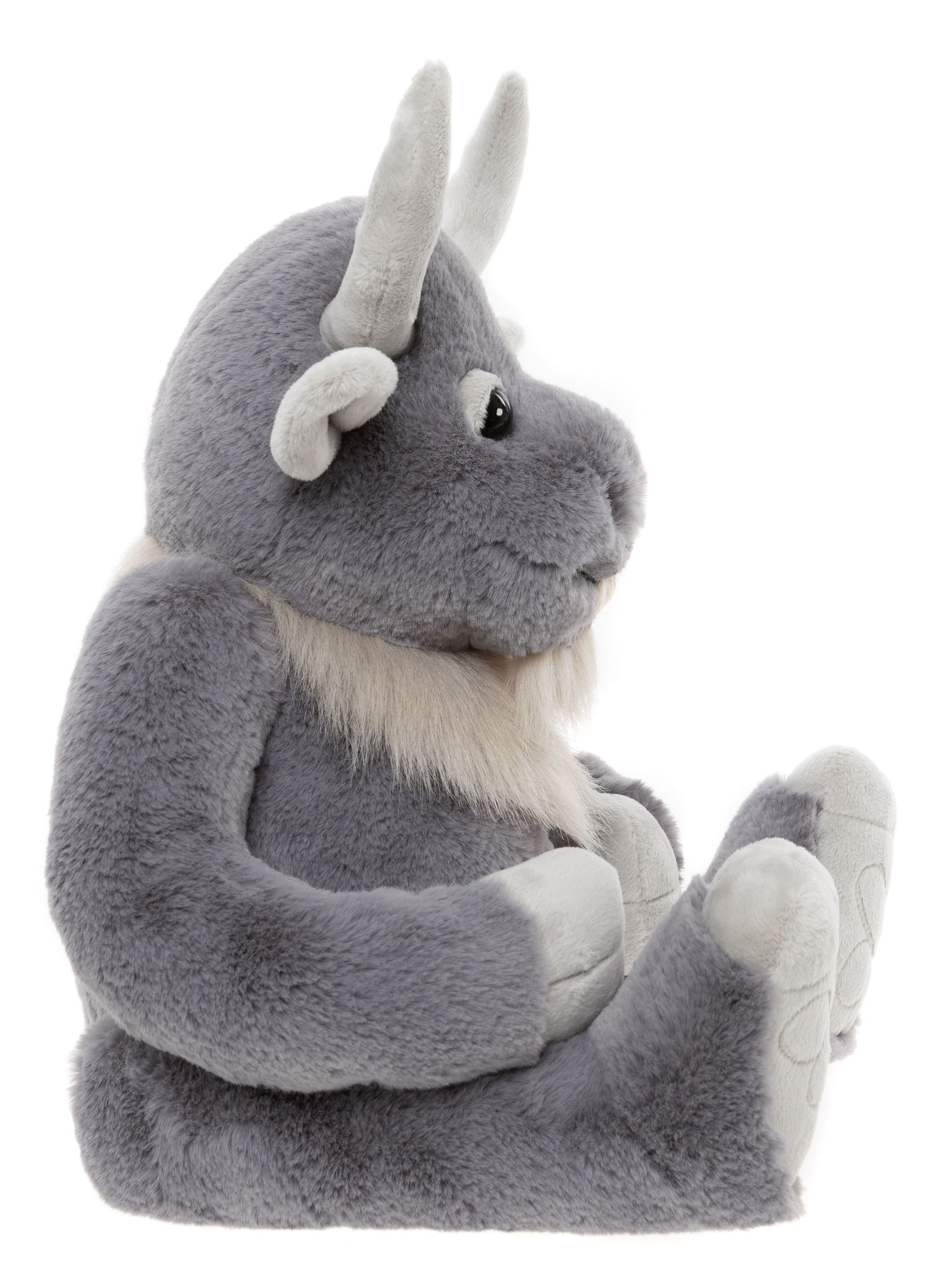 Crafted from luxuriously soft grey plush with lighter accents, Cobblestone has a soft beard, curved horns, and friendly expression which give him unmistakable character. Broad paws and detailed stitching add to his solid, comforting presence. He’s a true gentle giant, strong, steady, and full of heart. His non-jointed, machine-washable design makes him easy to care for and always ready for another day by your side.