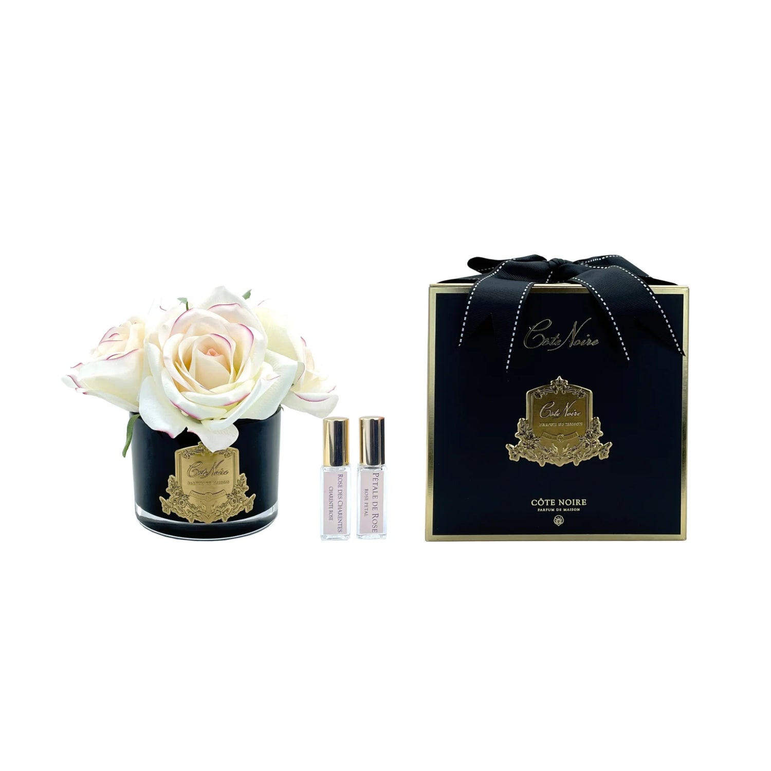 Each life-like perfumed Five Rose has been skilfully hand crafted and is set in gel giving it the appearance of water. Each petal has a special natural coating to give them a true to life touch and appearance and arranged in a clear vase with a gold signature Cote Noire badge.