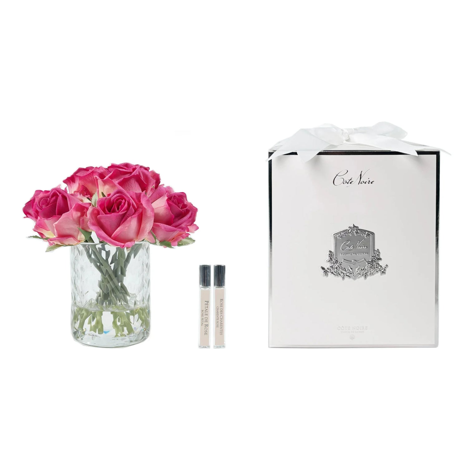 Each life-like perfumed Herringbone Rose Bud arrangement has been skilfully hand crafted and set in a water-like gel. Each petal has a special natural coating to give the arrangement a true to life touch & appearance. Arranged in a clear herringbone vase.