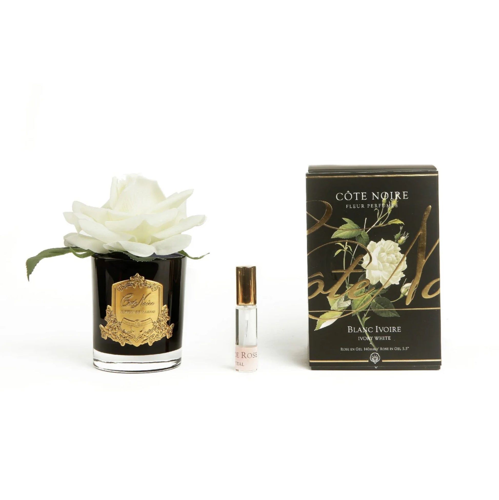 Cote Noire Single French Rose Perfumed Natural Touch Ivory White In Black Glass With Gold Crest