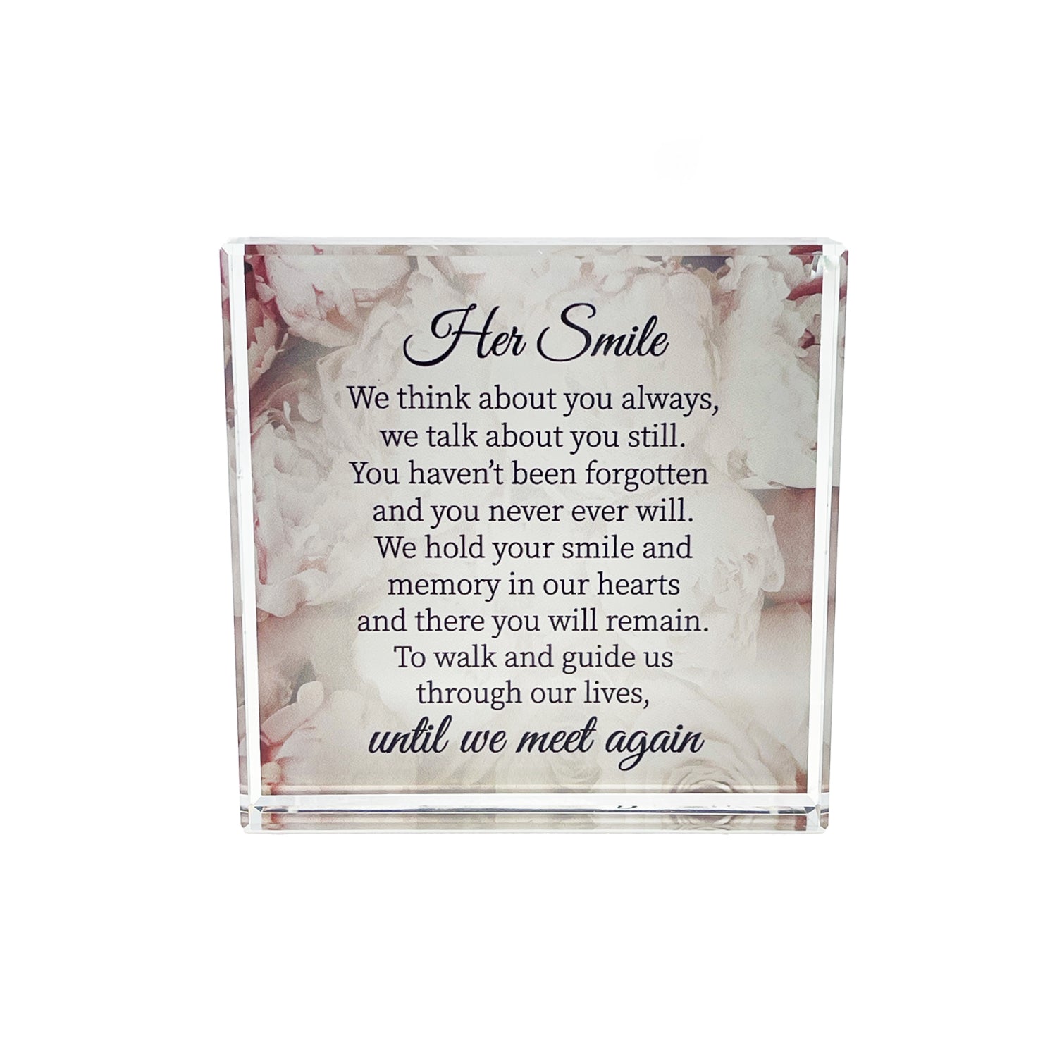 The Crystal Block Verse 'Her Smile' offers an elegant design combined with a heartfelt, personalized touch. Perfect as a memorial gift, this beautifully crafted crystal block features an inspiring verse that celebrates cherished memories. Its timeless design makes it a meaningful keepsake for honoring loved ones.