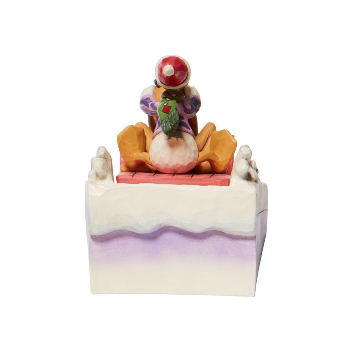 This pair prepares for a high velocity ride down Christmas Mountain. Bundled up, Donald grabs hold of Pluto for extra support as their sled coasts through the snow covered scenery in this Jim Shore design. With friends like these, winter is warmer.