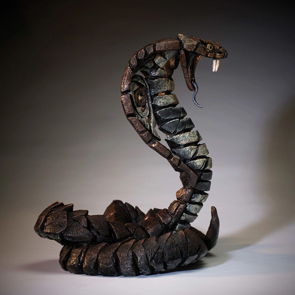 The Edge Sculpture Cobra Figure by Matt Buckley Statue is a stunning work of art that will leave a lasting impression on your visitors. This exquisitely handcrafted and hand painted statue is made of stone resin and measures about 40cm tall x 34cm long x 28cm wide. Designed and sculpted by Matt Buckley, this sculpture depicts a cobra in a classic pose with its head raised, fangs bared, and neck ribs expanded to form the unmistakable hood shape. It is perfect for display in an entryway, library, or lobby, and is sure to impress with its attention to detail and striking design.