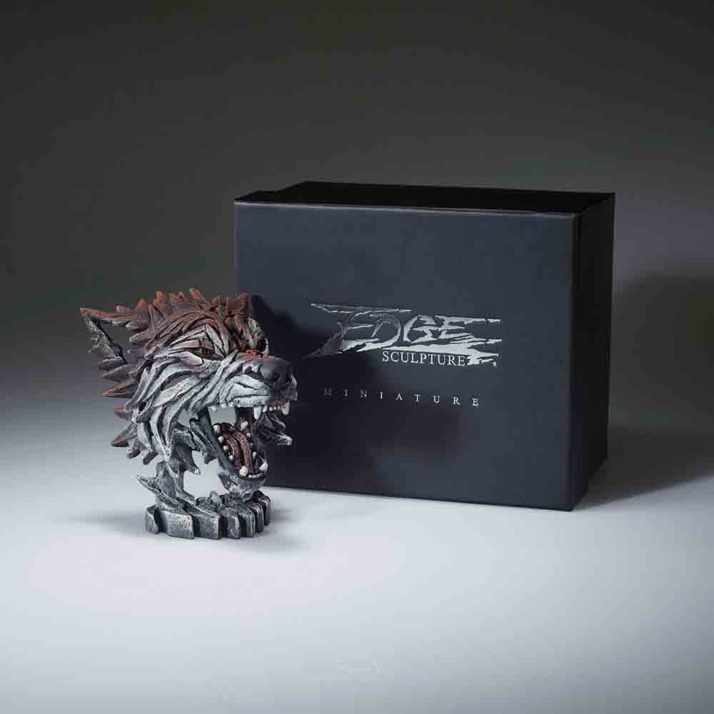 Welcome to the world of Edge Sculpture in Miniature. Influenced by style rather than subject, Matt Buckley presents a most striking collection of eclectic, contemporary sculptures. This stunning visual representation of a Wolf Bust has been brought to life in a miniature sculpture with intricate carvings outlining its canines, hand-painted with shades of grey and white. A creature of the night, Edge Sculpture's Wolf is a modern yet utterly affordable piece to showcase in homes. All Edge Sculpture Miniatures are presented in a matt black lidded gift box adorned with a silver foil logo.