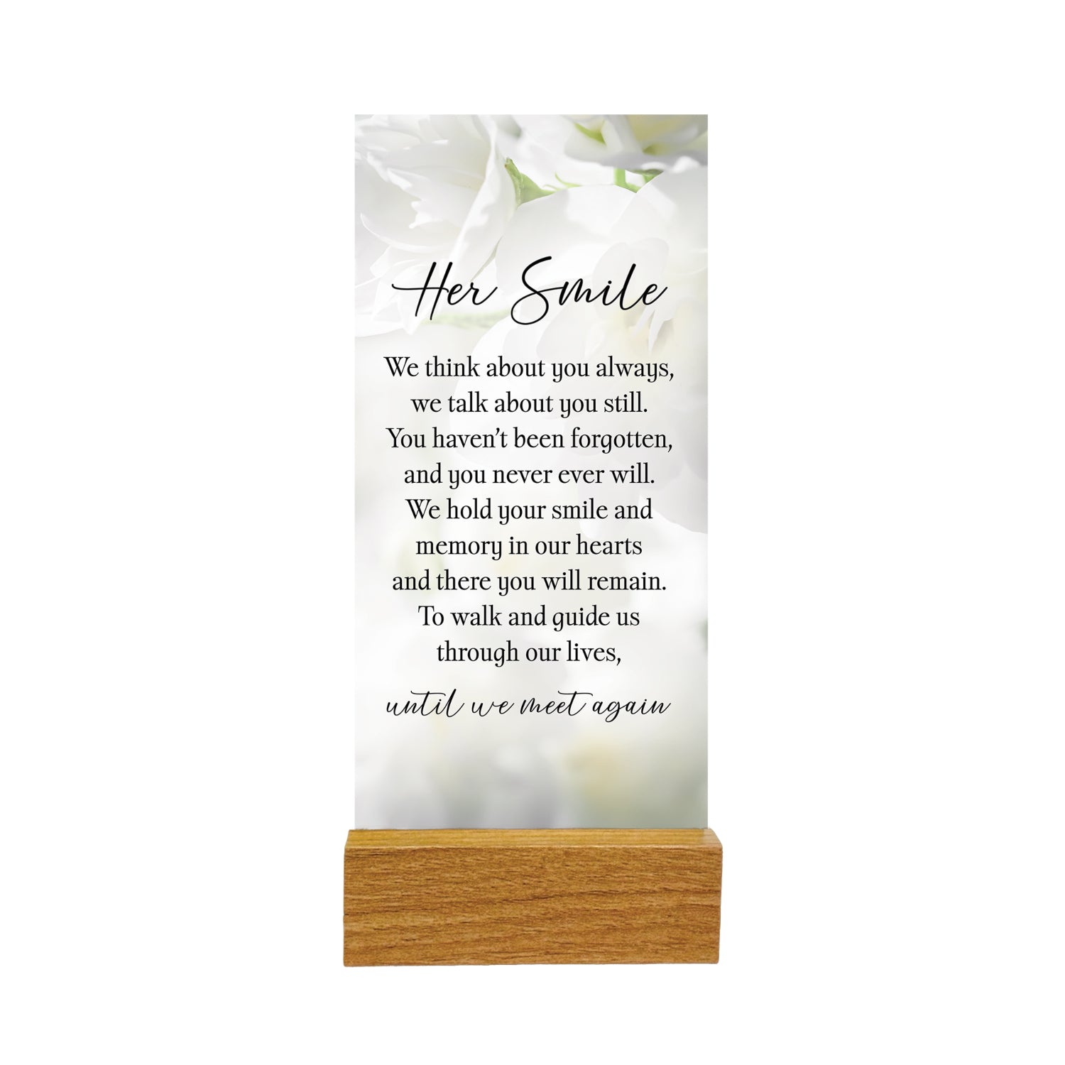 The Glass Plaque with Stand 'Her Smile' features a touching verse paired with an elegant design, making it a meaningful keepsake. Crafted from high-quality glass, it is designed to add a timeless and delicate touch to any space. Complete with a sturdy stand, it serves as a thoughtful memorial gift to honor and cherish loved ones. Its compact size ensures easy placement on desks, shelves, or mantels.