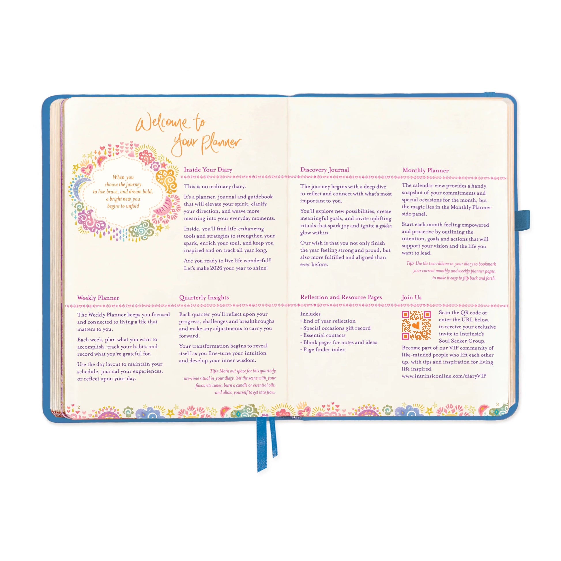 While the cover title and message of each Intrinsic Diary have different themes, all diaries have the exact same inside pages, which include: