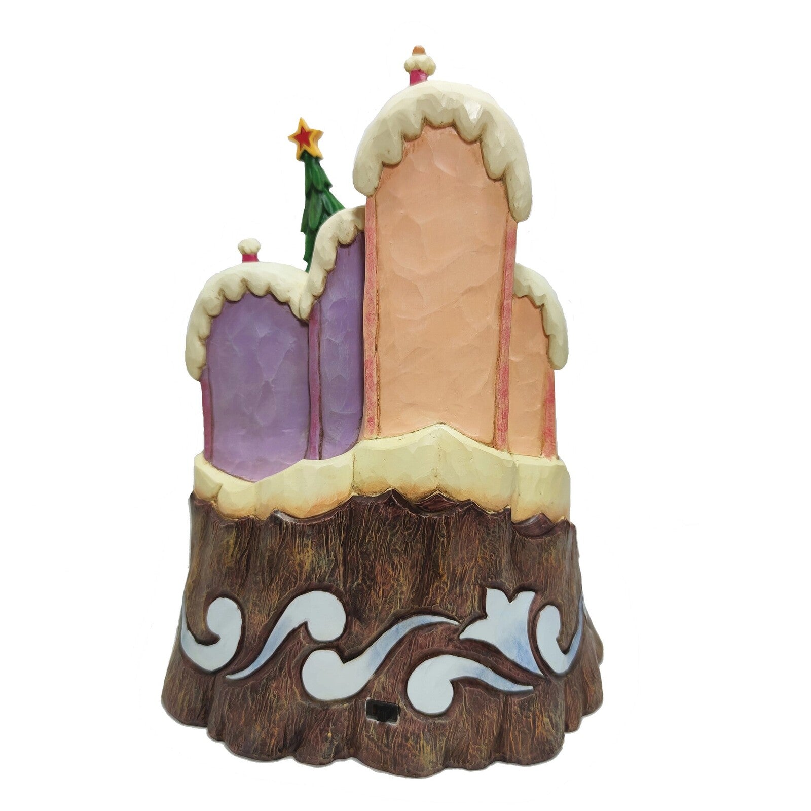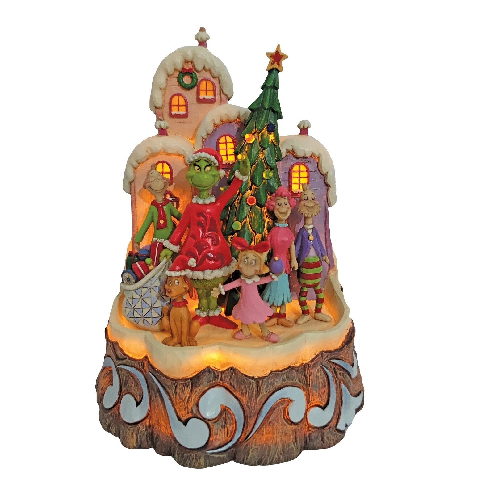 With an honest smile, the Grinch, by Jim Shore, has realized the true meaning of Christmas and for once, feels love in his heart. Together with Max and the residents of Whoville, Grinch waves solemnly with Cindy Lou Who in the decorated town.