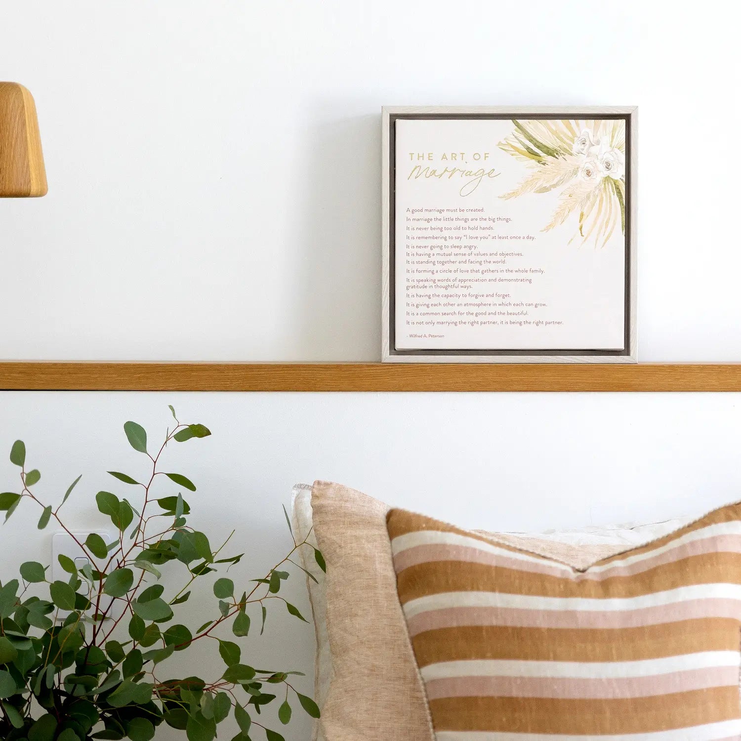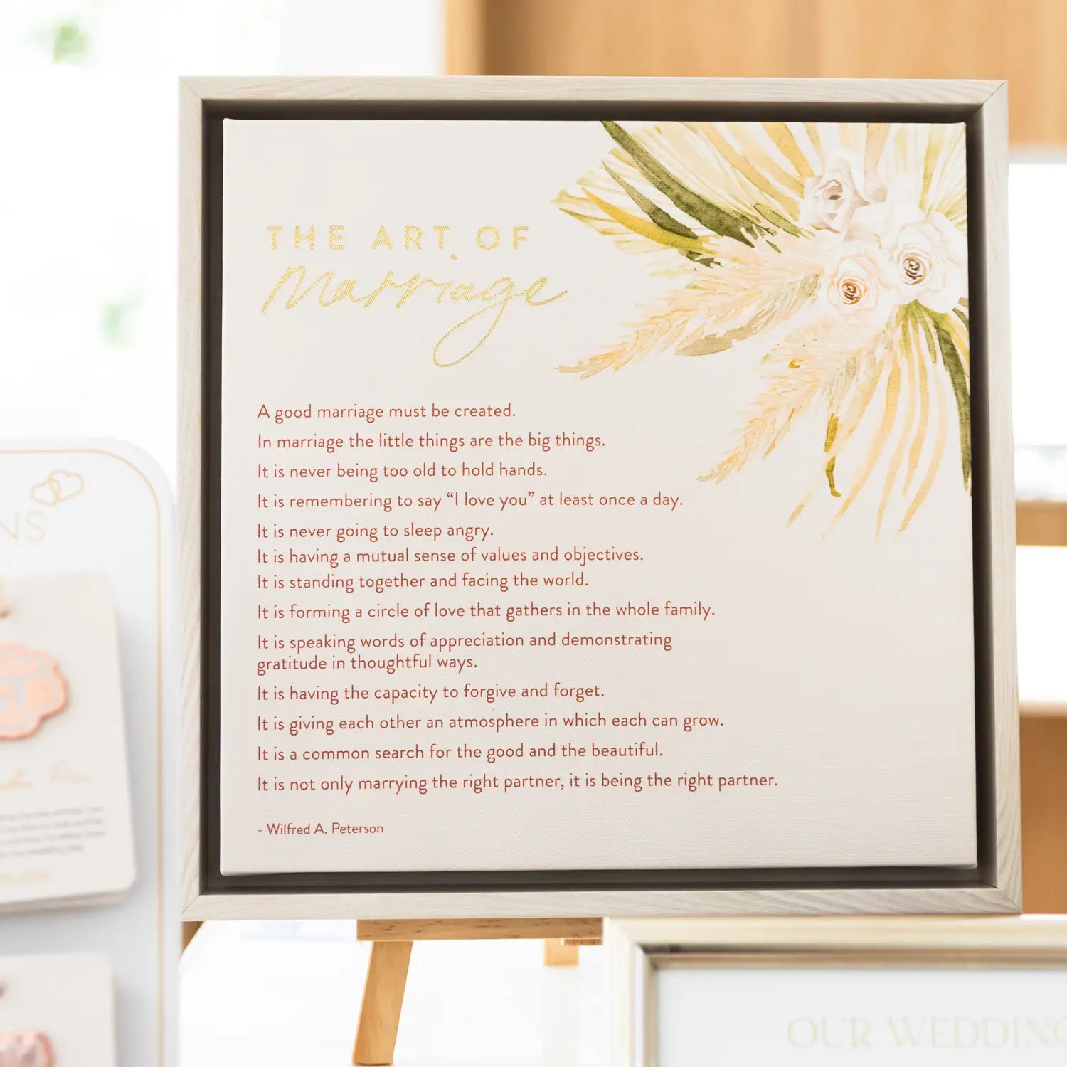 Celebrate love and commitment with the Wedding Framed Canvas 'The Art of Marriage.' Featuring an elegant design and a touching verse, this piece serves as a timeless keepsake for any couple. Perfect for anniversaries, weddings, or as a heartfelt gift, it adds a meaningful touch to any home décor.