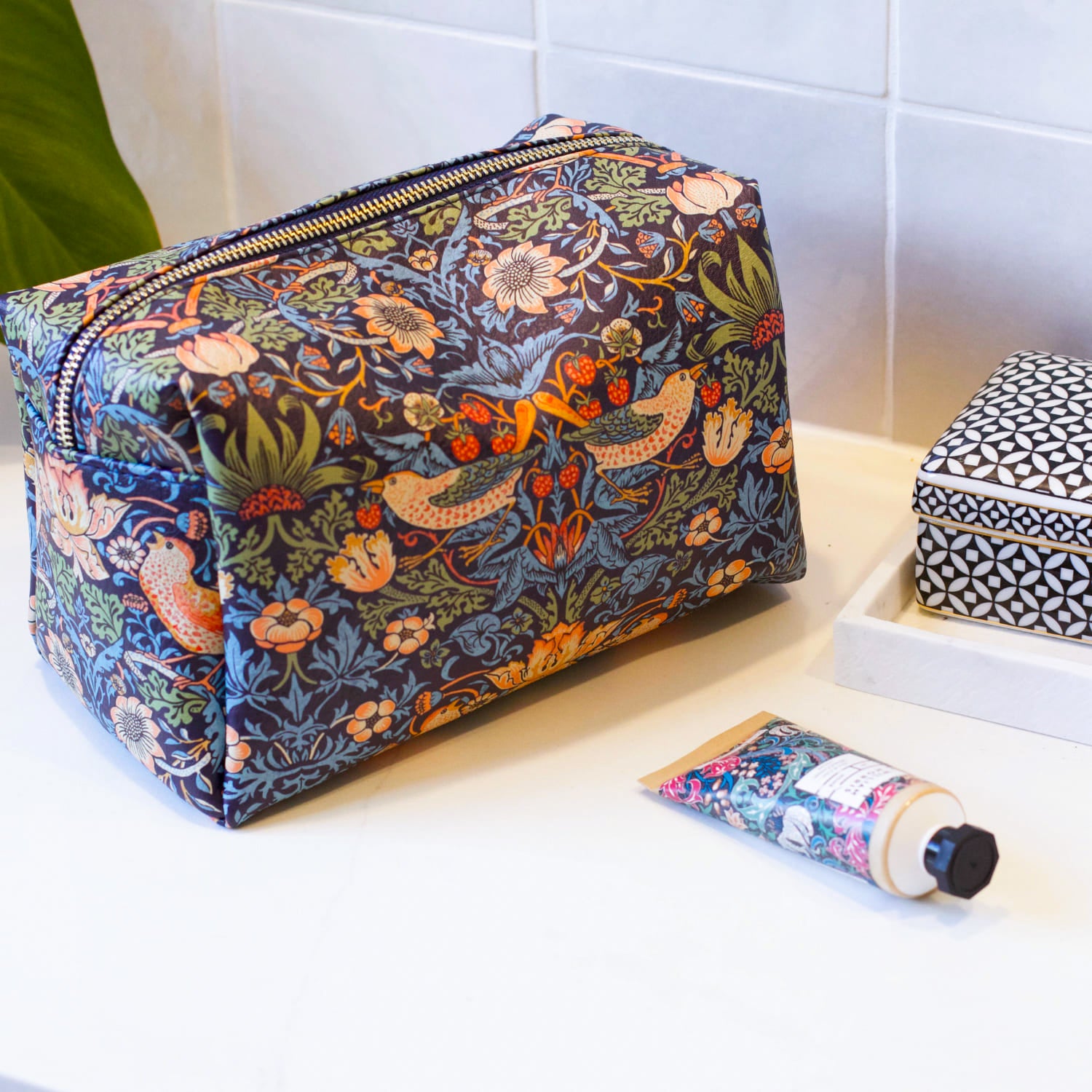 - Spacious wash bag featuring the iconic Strawberry Thief design in rich navy tones.