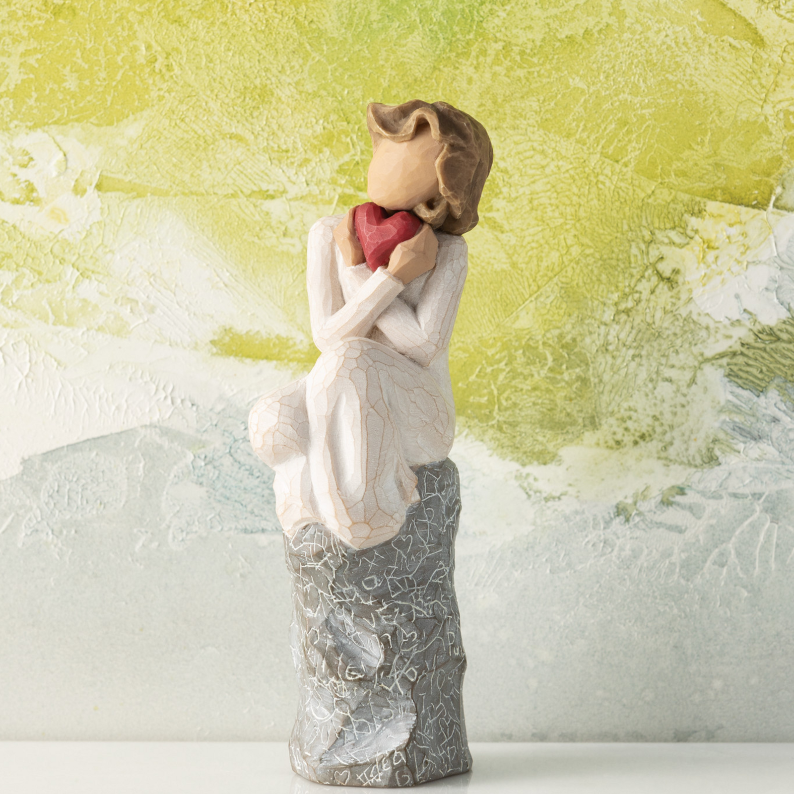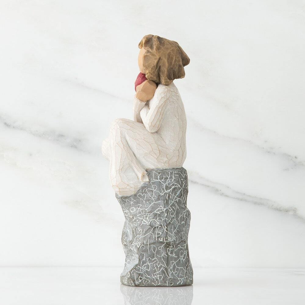 A lady sitting on an etched rock and holding a red heart. A wedding, anniversary or Valentine’s Day gift that expresses love and caring.