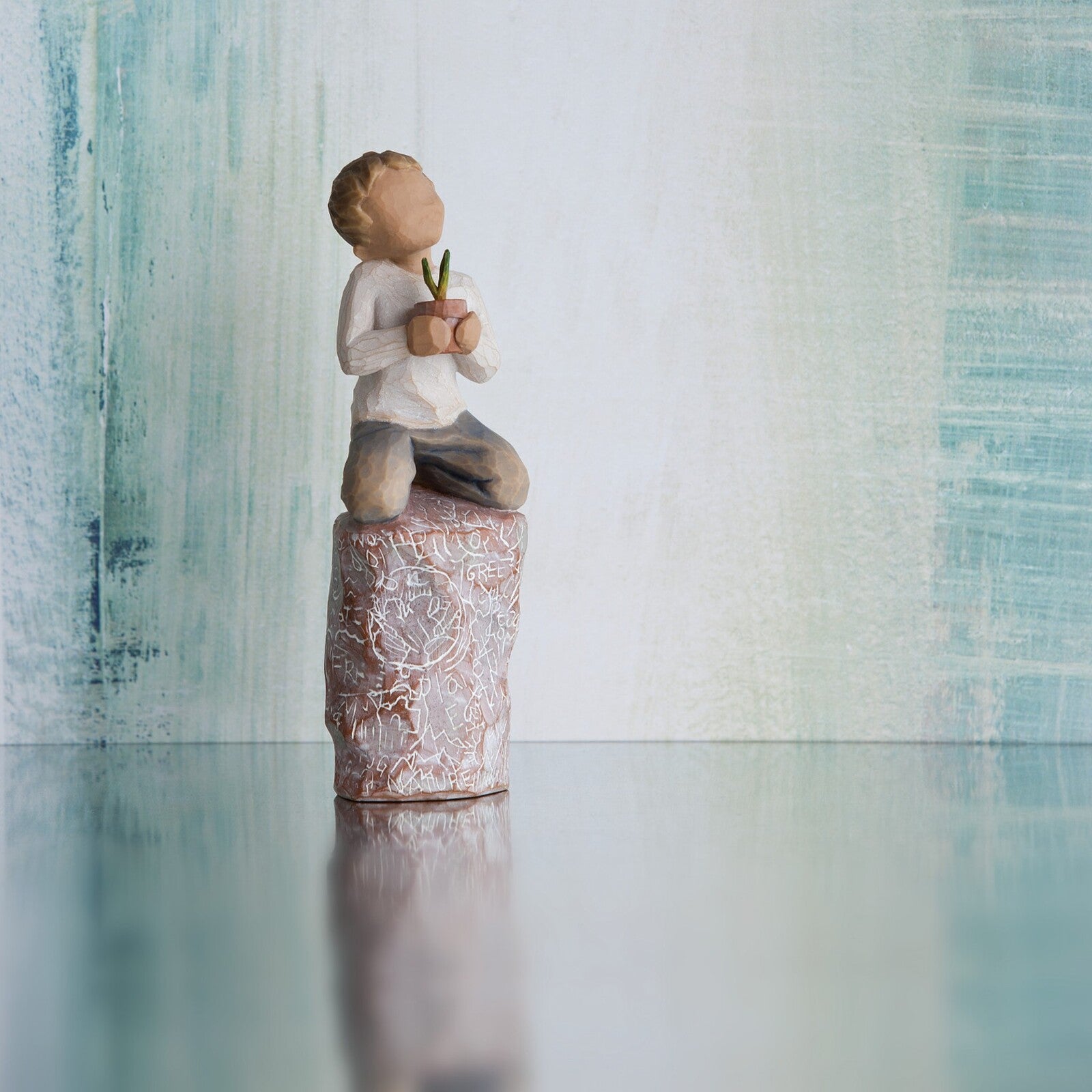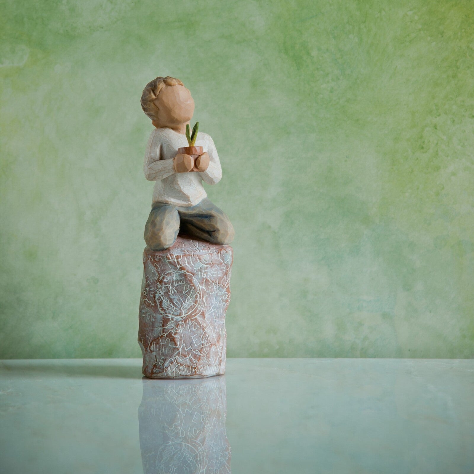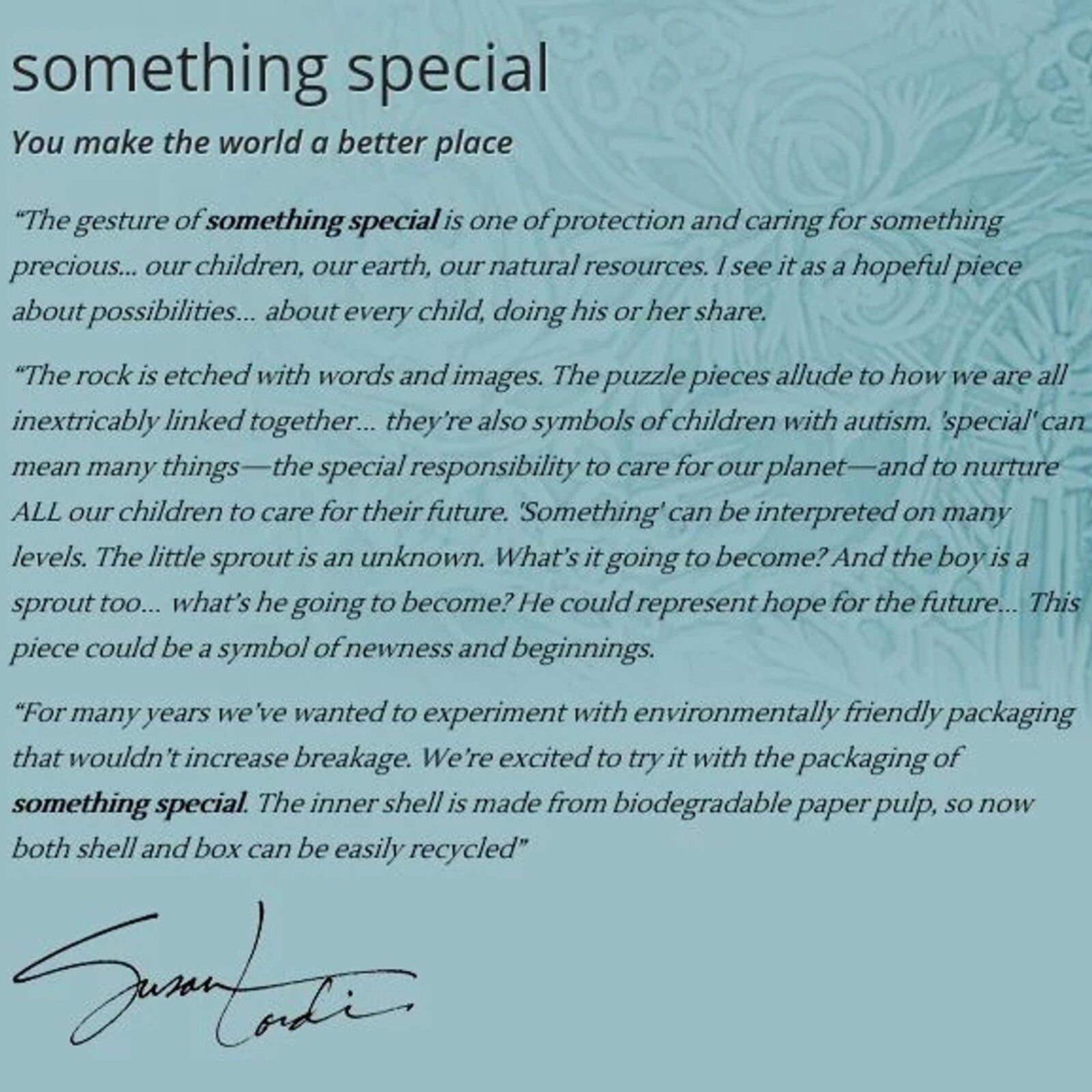 “The gesture of something special is one of protection and caring for something precious... our children, our earth, our natural resources. I see it as a hopeful piece about possibilities… about every child, doing his or her share. The rock is etched with words and images. The puzzle pieces allude to how we are all inextricably linked together… they’re also symbols of children with autism. 'special' can mean many things - the special responsibility to care for our planet - and to nurture ALL our children to care for their future. 'something' can be interpreted on many levels. The little sprout is an unknown. What’s it going to become? And the boy is a sprout too… what’s he going to become? He could represent hope for the future… This piece could be a symbol of newness and beginnings. Also...For many years we’ve wanted to experiment with environmentally friendly packaging that wouldn’t increase breakage. We’re excited to try it with the packaging of something special. The inner shell is made from biodegradable paper pulp, so now both shell and box can be easily recycled." ~ Susan Lordi